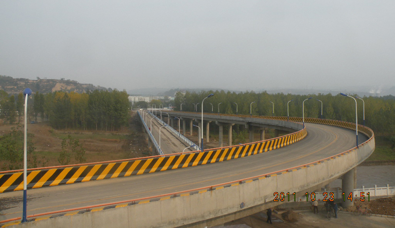 國(guó)電霍州發(fā)電廠跨汾河公路大橋東接國(guó)道108線(霍侯一級(jí)公路),西連電廠運(yùn)煤公路,東接口處南有霍州礦務(wù)局木材加工廠,北有個(gè)體汽車(chē)修理廠,居民較少。向西跨越汾河進(jìn)入電廠廠區(qū)后要上跨電廠主要出入道路。橋梁分左、右幅:左幅主要承擔(dān)電廠職工的生產(chǎn)、生活用車(chē)通行;右幅主要承擔(dān)電廠運(yùn)煤、運(yùn)渣等車(chē)輛通行。終點(diǎn)要與國(guó)道108線(霍侯一級(jí)公路)相連接,接點(diǎn)位置位于國(guó)道108線K826+160處。