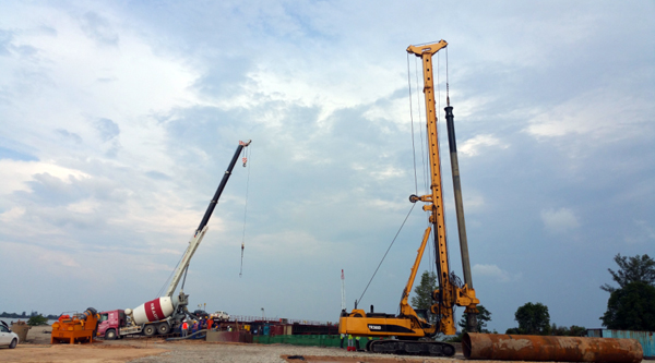 文萊PMB跨海大橋首根試樁鉆孔直徑1.5m,鉆孔深度68.6m,灌注混凝土120方。試樁內(nèi)裝有“荷載箱”兩組,鋼筋應力計52組。通過技術(shù)攻關(guān),首根試樁的鉆孔垂直度、泥漿參數(shù)、沉渣厚度等指標均滿足歐標要求,順利通過總包、監(jiān)理驗收。尤其是混凝土灌注施工,有了鉆孔質(zhì)量的保證,混凝土灌注導管自由的在布設有兩組關(guān)卡的“荷載箱”內(nèi)安放、提拔,獲得了總包方和監(jiān)理方稱贊,監(jiān)理工程師向我們豎起了大拇指。我們以一流的管理、先進的設備、精湛的技術(shù),進一步擦亮了“河北建勘”品牌。