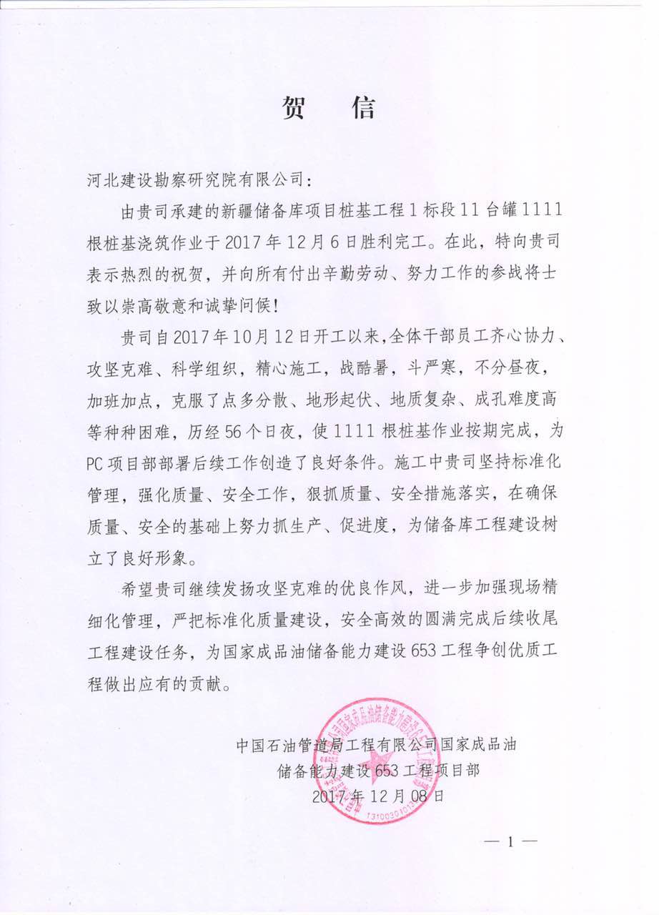 我公司承建的新疆儲(chǔ)備庫(kù)項(xiàng)目樁基工程1標(biāo)段11臺(tái)罐1111根樁基澆筑作業(yè)于2017年12月6日勝利完工。中國(guó)石油管道局工程有限公司國(guó)家成品油儲(chǔ)備能力建設(shè)653工程項(xiàng)目部發(fā)來(lái)賀信,對(duì)我項(xiàng)目部重安全,重質(zhì)量的工作作風(fēng)表示充分地肯定,也對(duì)我項(xiàng)目部為儲(chǔ)備庫(kù)工程建設(shè)樹立良好形象提出了表?yè)P(yáng)。