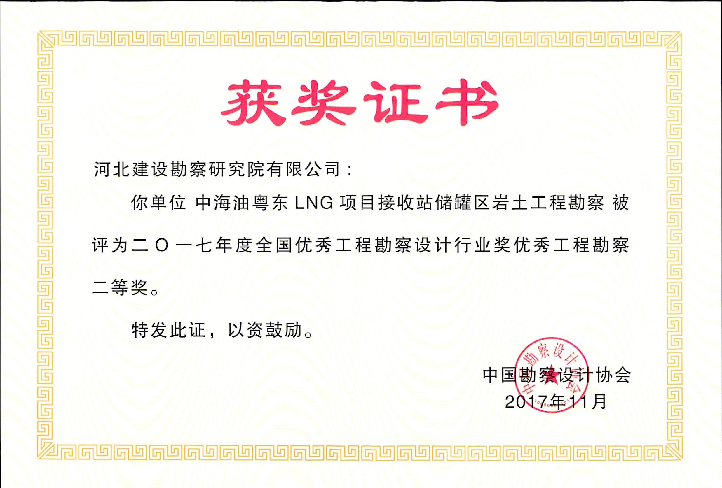 根據(jù)中國勘察設(shè)計(jì)協(xié)會(huì)2017年11月29日發(fā)布的中設(shè)協(xié)字【2017】85號(hào)文件《關(guān)于公布2017年度全國優(yōu)秀工程勘察設(shè)計(jì)行業(yè)獎(jiǎng)評選結(jié)果的通知》,我公司兩項(xiàng)工程獲優(yōu)秀工程勘察獎(jiǎng)。其中,山東東岳能源交口肥美鋁業(yè)有限公司1#赤泥堆場勘察與加固治理工程榮獲優(yōu)秀工程勘察一等獎(jiǎng),中海油粵東LNG項(xiàng)目接收站儲(chǔ)罐區(qū)巖土工程勘察榮獲優(yōu)秀工程勘察二等獎(jiǎng)。