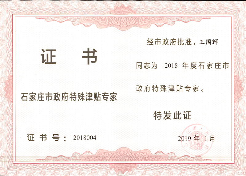 經(jīng)石家莊市人力資源和社會(huì)保障局評(píng)審,石家莊市人民政府同意,我公司王國(guó)輝同志榮獲石家莊市政府特殊津貼專家稱號(hào)。