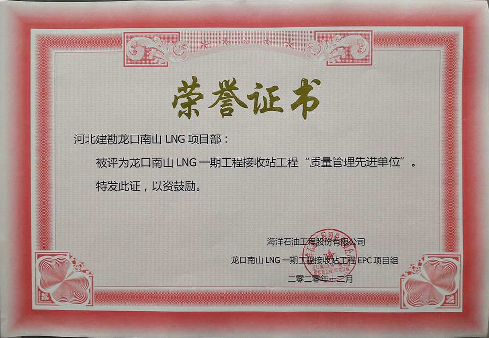 2020年12月,公司收到海洋石油工程股份有限公司發(fā)來的表揚(yáng)信,對(duì)我公司在龍口南山LNG一期工程接收站工程EPC項(xiàng)目?jī)?chǔ)罐樁基工程標(biāo)段一施工過程中,面對(duì)施工現(xiàn)場(chǎng)地質(zhì)情況復(fù)雜、新工藝、施工難度大、氣候炎熱多雨、新冠疫情、人材機(jī)緊缺等不利因素,按合同要求順利完成了一標(biāo)段1#和2#儲(chǔ)罐3497根振沖碎石樁和720根樁柱一體化灌注樁全部施工任務(wù),給予了高度認(rèn)可和好評(píng),并表示感謝!我公司被評(píng)為“質(zhì)量管理先進(jìn)單位”和“HSE管理先進(jìn)單位”并頒發(fā)了榮譽(yù)證書,同時(shí)對(duì)先進(jìn)個(gè)人頒發(fā)了“優(yōu)秀項(xiàng)目管理者”、 “HSE管理先進(jìn)個(gè)人”、 “質(zhì)量管理先進(jìn)個(gè)人”榮譽(yù)證書。