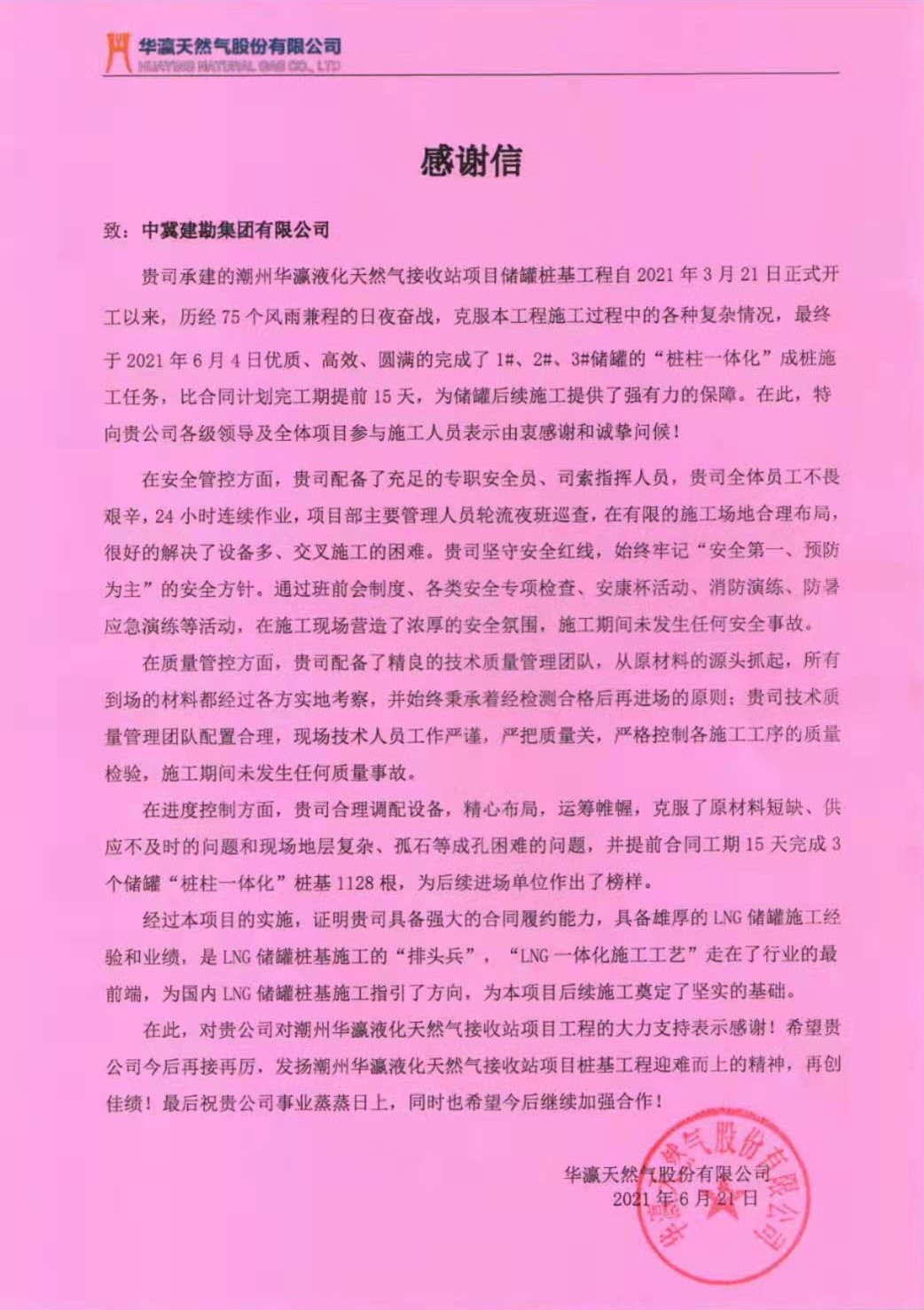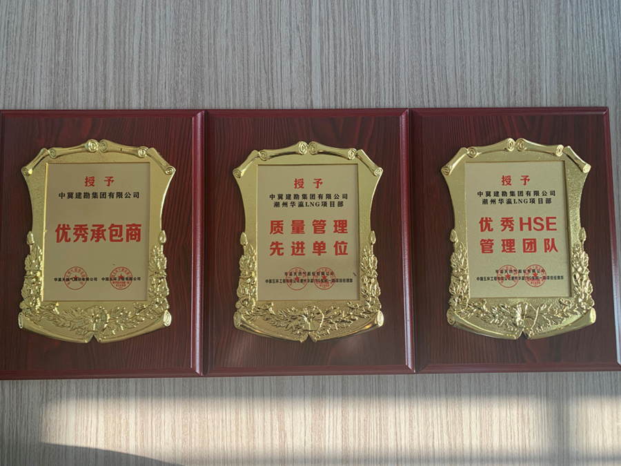 近日,由我公司承建的潮州華瀛液化天然氣接收站項(xiàng)目?jī)?chǔ)罐工程樁基施工項(xiàng)目,榮獲華瀛天然氣股份有限公司和中國(guó)五環(huán)工程有限公司潮州華瀛LNG項(xiàng)目部頒發(fā)的“優(yōu)秀承包商”、“質(zhì)量管理先進(jìn)單位”和“優(yōu)秀HSE管理團(tuán)隊(duì)”的榮譽(yù)獎(jiǎng)牌以及感謝信。