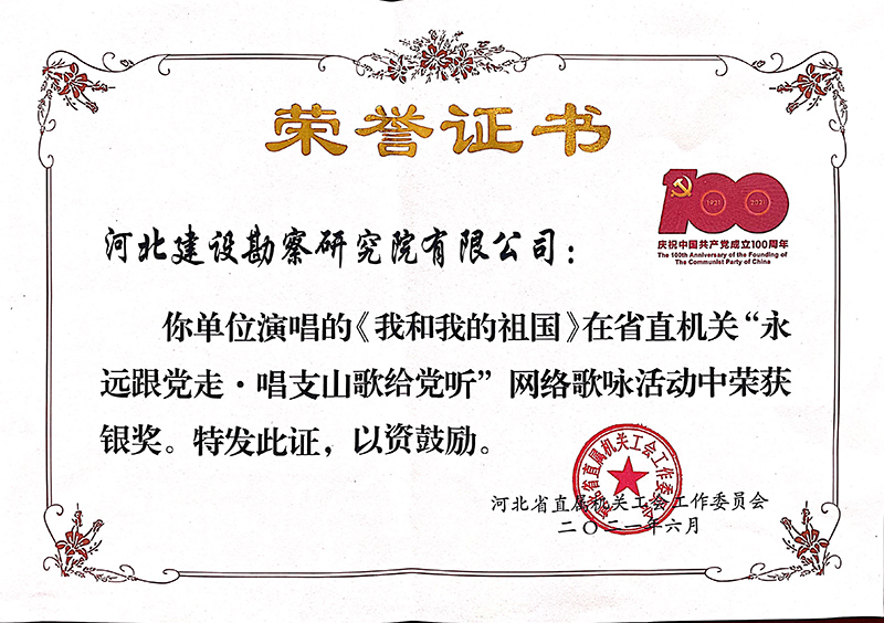 為慶祝中國共產(chǎn)黨建黨100周年,謳歌建黨百年的光輝歷程和豐功偉績,今年以來,公司開展了建黨百年系列慶?;顒?,并積極響應(yīng)上級黨組織工作安排,先后參加了由省直工會組織開展的“永遠(yuǎn)跟黨走•唱支山歌給黨聽”網(wǎng)絡(luò)歌詠活動和省住房和城鄉(xiāng)建設(shè)廳舉辦的“唱響主旋律 頌歌獻(xiàn)給黨”歌詠比賽,用嘹亮的歌聲和飽含深情的演唱充分展示了中冀建勘人積極向上的精神風(fēng)貌,并在比賽中取得優(yōu)秀的成績。