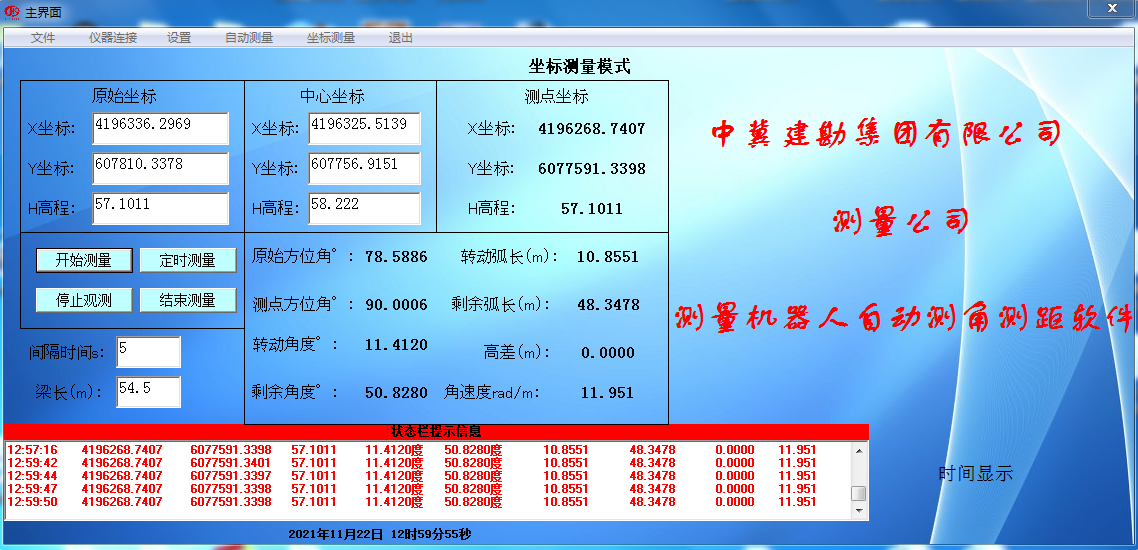 在橋梁轉(zhuǎn)體過程中,我們采用國內(nèi)最先進(jìn)的全自動測量機(jī)器人并結(jié)合自主研發(fā)的跟蹤測量軟件,對橋梁實(shí)施運(yùn)行軌跡和震動監(jiān)控監(jiān)測。在轉(zhuǎn)體過程中嚴(yán)格控制轉(zhuǎn)體橋轉(zhuǎn)體角速度,并對軸線合攏進(jìn)行測量,指揮施工單位對轉(zhuǎn)體橋進(jìn)行點(diǎn)動,最終達(dá)到設(shè)計(jì)要求,本次軸線合攏精度達(dá)到5mm,滿足設(shè)計(jì)要求。