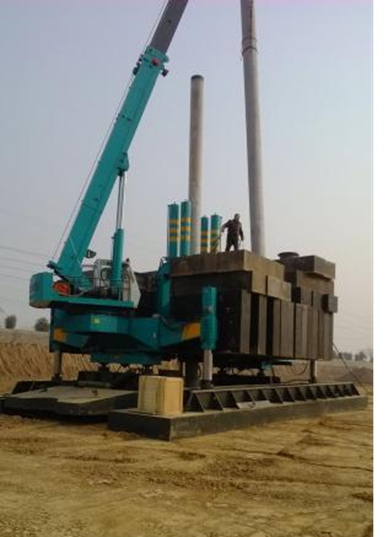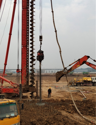 本工程2#、3#廠房樁基成孔采用長螺旋后插筋工藝,混凝土壓灌完成后,進行鋼筋籠安放工作,鋼筋籠安放采用25T吊車和振桿、震動器(采用閉合式鏈接)配合進行。鋼筋籠下入孔中后,保證在孔內居中,先由鋼筋籠量與振錘自身的重量讓鋼筋籠自行下沉,當不能自行下沉時(約達到3/1-3/2籠長時),立即開動震錘,邊振動混凝時鋼筋籠邊隨著下沉,鋼筋籠隨著振動下沉至到樁頂標高位置后,采用雙吊筋固定鋼筋籠位置,緩慢將導管從樁身中拔出,并開動震錘,即完成了該樁的施工。當遇見孔口下沉現(xiàn)象時,先用人工清理出表面混凝土,再由鉆機開至孔口進行補方。