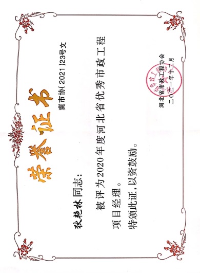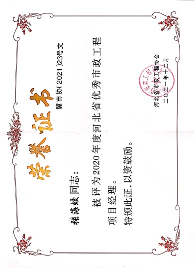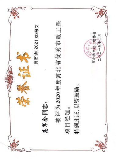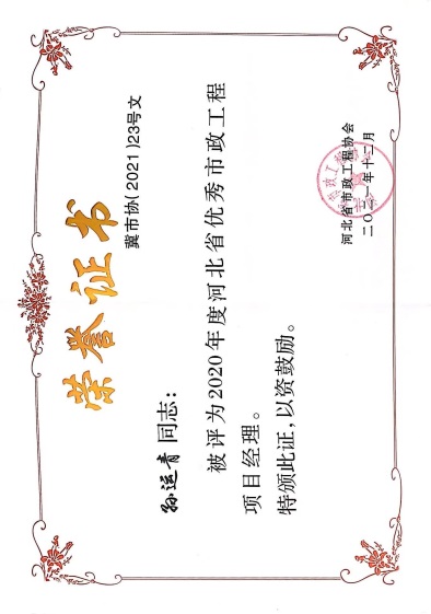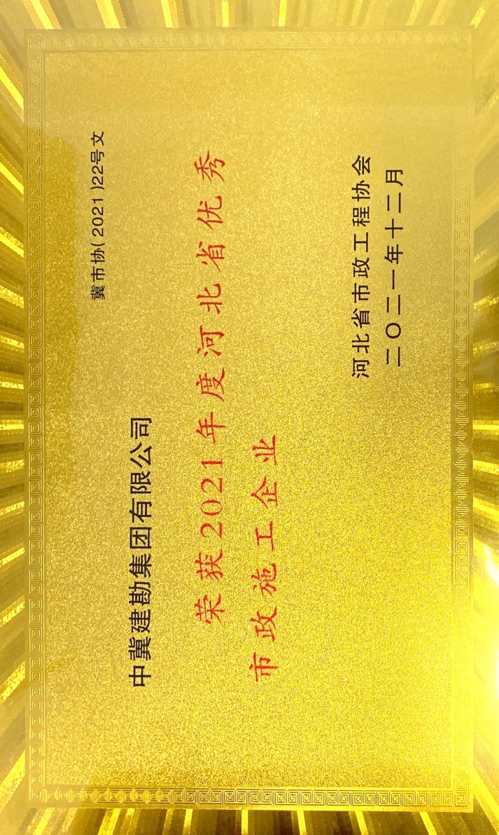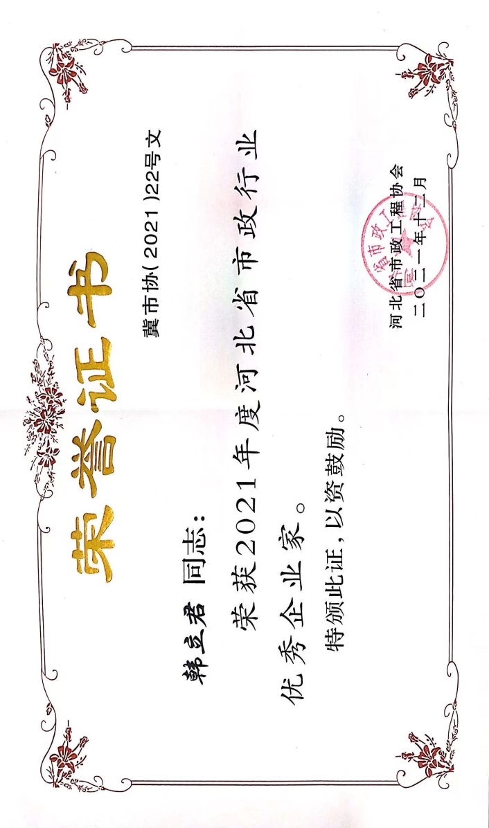 近日,由河北省市政工程協(xié)會評選,公司榮獲“2021年度河北省優(yōu)秀市政施工企業(yè)”稱號;韓立君董事長榮獲“2021年度河北省市政行業(yè)優(yōu)秀企業(yè)家”稱號;孫運青、狄艷林、高軍會、張海蛟四位同志榮獲“2020年度河北省優(yōu)秀市政工程項目經(jīng)理”稱號。