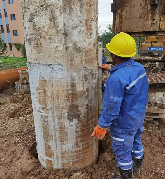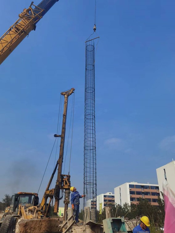 本項(xiàng)目位于河北邯鄲永年縣,受河北永洋特鋼集團(tuán)有限公司委托,我公司承擔(dān)本項(xiàng)目樁基施工?;A(chǔ)采用混凝土灌注樁,工程內(nèi)容為全套管旋挖機(jī)械成孔、清運(yùn)余土(渣土)、鋼筋籠制作及安放、混凝土澆筑、鑿樁頭、清運(yùn)及場地平整。工作量為樁徑800mm混凝土灌注樁174根。