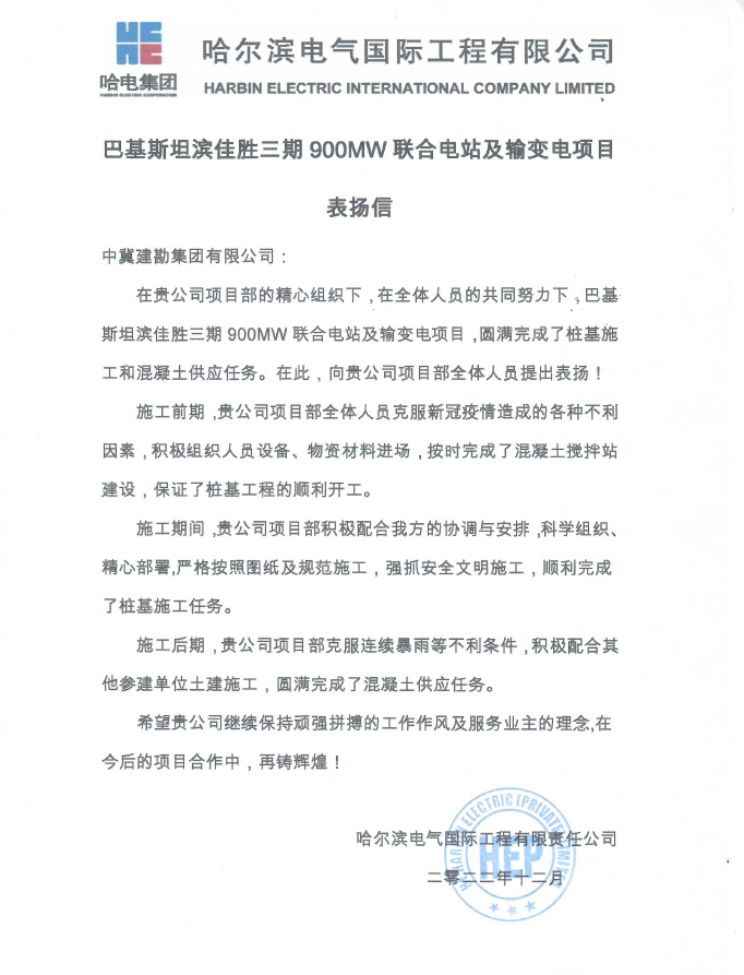 巴基斯坦濱佳勝三期900MW聯(lián)合電站及輸變電項(xiàng)目,圓滿完成了樁基施工和混凝土供應(yīng)任務(wù)。施工期間,項(xiàng)目部員工積極配合業(yè)主的協(xié)調(diào)與安排,科學(xué)組織、精心部署,嚴(yán)格按照圖紙及規(guī)范施工,在克服連續(xù)暴雨等不利條件,搶抓安全文明施工,確保圓滿完成施工任務(wù)。我們頑強(qiáng)拼搏的工作作風(fēng)及服務(wù)業(yè)主的理念得到了業(yè)主的高度認(rèn)可。