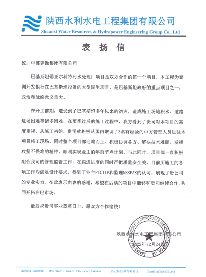 巴基斯坦錫亞爾科特污水處理廠項(xiàng)目是我方和陜西水利水電工程集團(tuán)有限公司合作的第一個項(xiàng)目,是亞洲開發(fā)銀行在巴基斯坦投資的大型民生項(xiàng)目,是巴基斯坦政府的重點(diǎn)項(xiàng)目之一,政治和戰(zhàn)略意義重大。在工程前期,遭受到了巴基斯坦多年以來的洪災(zāi),造成施工場地積水、道路進(jìn)場等諸多困難。我們整個項(xiàng)目部高度重視,迎難而上、積極協(xié)調(diào)各方、解決技術(shù)難題、發(fā)揮攻堅(jiān)不畏難的精神,順利實(shí)現(xiàn)業(yè)主的年前節(jié)點(diǎn)計(jì)劃。目前施工的各項(xiàng)工作均滿足設(shè)計(jì)要求,得到了業(yè)主PICIIP和監(jiān)理NESPAK的認(rèn)可,展現(xiàn)了我公司的專業(yè)實(shí)力。業(yè)主希望在后續(xù)的項(xiàng)目中能夠和我公司繼續(xù)合作,共同開拓巴基斯坦市場。