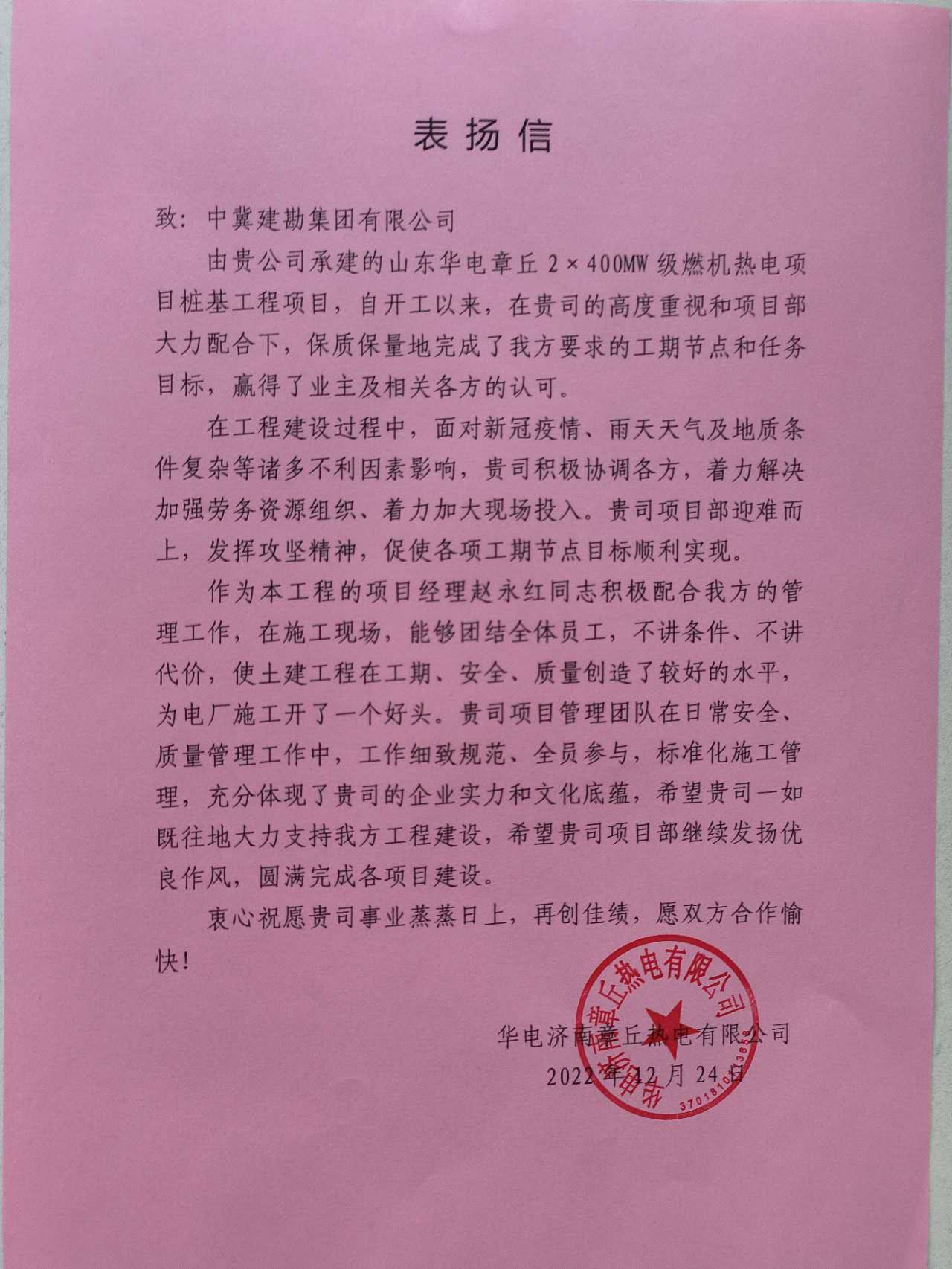 山東華電章丘2×400MW級燃機(jī)熱電項(xiàng)目樁基工程,在工程建設(shè)過程中,面對新冠疫情、雨天天氣及地質(zhì)條件復(fù)雜等諸多不利影響,在項(xiàng)目經(jīng)理趙永紅同志的帶領(lǐng)下,能夠團(tuán)結(jié)一致,不講條件,使土建工程在工期、安全、質(zhì)量創(chuàng)造了較好的水平,為電廠施工開了一個好頭。項(xiàng)目管理團(tuán)隊(duì)在日常安全、質(zhì)量管理工作中,工作細(xì)致規(guī)范、標(biāo)準(zhǔn)化施工管理,充分體現(xiàn)了我公司的企業(yè)實(shí)力和文化底蘊(yùn)。