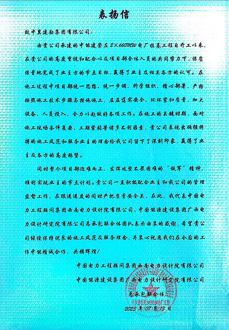 華電龍口發(fā)電有限公司四期項目2號機(jī)組于2023年12月17日20時04分順利完成168小時滿負(fù)荷試運(yùn)行。工程建設(shè)期間,完成了各項安健環(huán)活動,并在安全管理方面取得良好的效果,贏得了業(yè)主方認(rèn)可。我公司人員嚴(yán)格遵守我公司規(guī)章制度,急業(yè)主之所急,想業(yè)主之所想,統(tǒng)籌協(xié)調(diào)資源,展現(xiàn)了良好的精神風(fēng)貌、履約能力、企業(yè)品牌形象。為此,業(yè)主特向我公司各級領(lǐng)導(dǎo)、項目團(tuán)隊在工程施工過程中給予的支持和幫助表示由衷感謝。