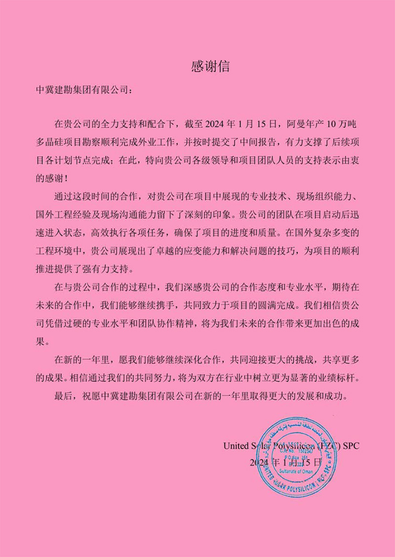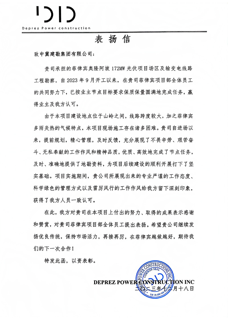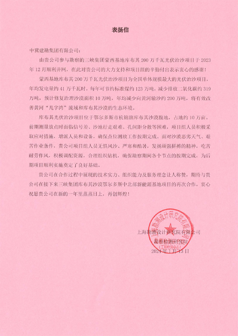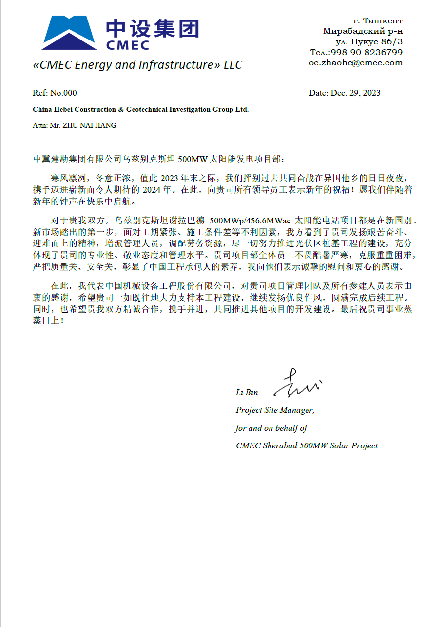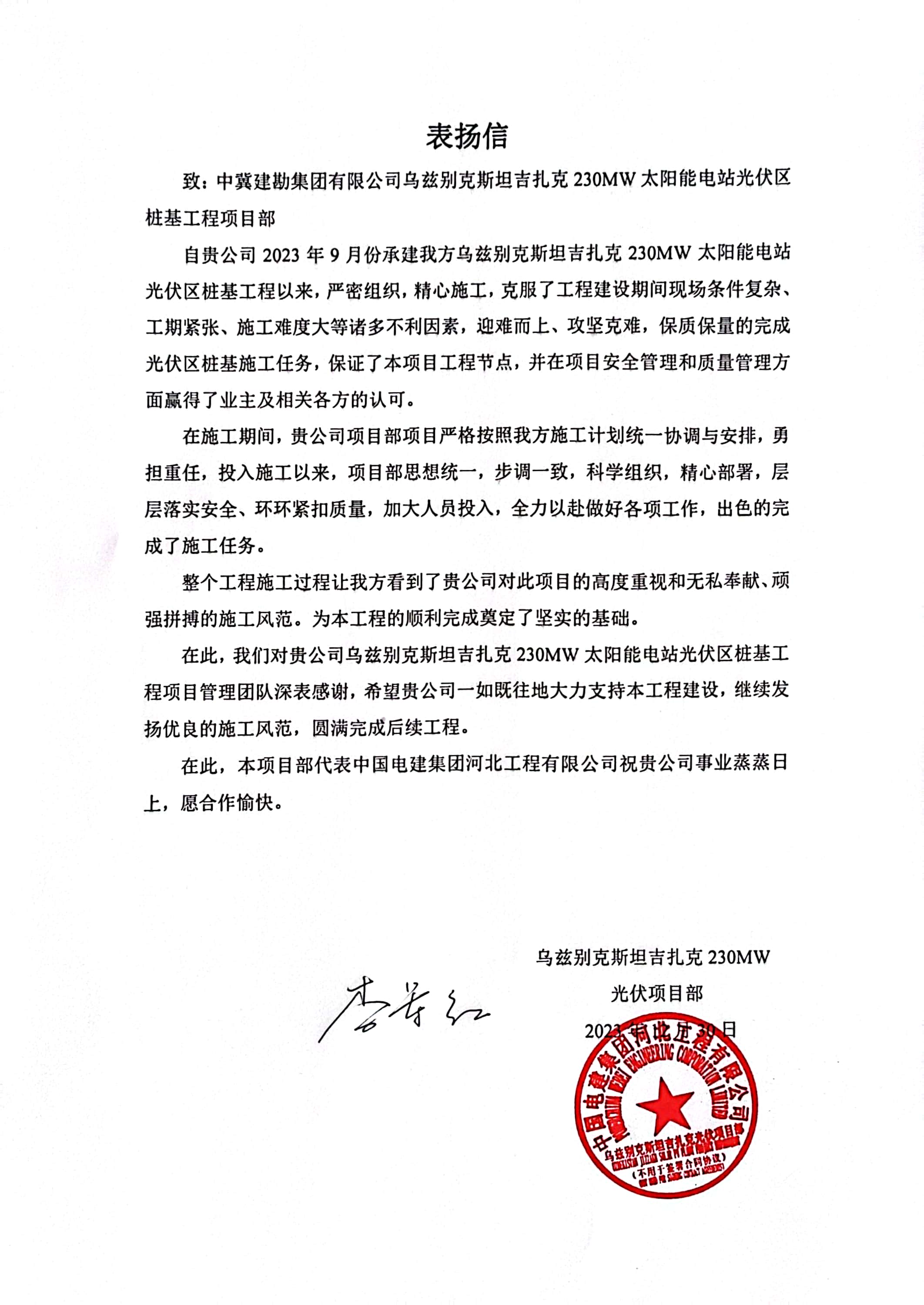 中國(guó)機(jī)械設(shè)備工程股份有限公司發(fā)來(lái)的表?yè)P(yáng)信,對(duì)在烏茲別克斯坦謝拉巴德 500MWp/456.6MWac 太陽(yáng)能電站項(xiàng)目建設(shè)過(guò)程中,項(xiàng)目全體人員克服諸多不利因素,發(fā)揚(yáng)建勘精神,盡一切努力推進(jìn)工程建設(shè),以及公司的專業(yè)性、敬業(yè)態(tài)度和管理水平給予了高度評(píng)價(jià)。同時(shí),對(duì)項(xiàng)目管理團(tuán)隊(duì)及所有參建人員表示由衷的感謝,并希望雙方精誠(chéng)合作,攜手并進(jìn),共同推進(jìn)其他項(xiàng)目的開(kāi)發(fā)建設(shè)。