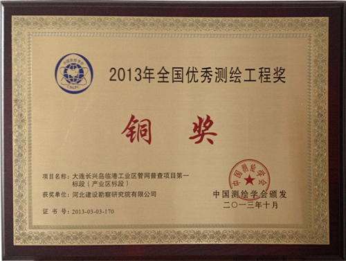 近日,由我公司完成的大連長興島臨港工業(yè)區(qū)管網(wǎng)普查項(xiàng)目第一標(biāo)段(產(chǎn)業(yè)區(qū)標(biāo)段)被中國測繪學(xué)會評為優(yōu)秀測繪工程銅獎(jiǎng)。