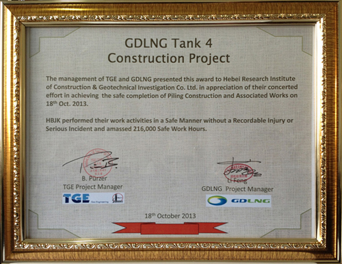 廣東大鵬LNG工程自2013年4月18日開工,至2013年9月4日完成樁基施工,10月份完成包括鑿樁頭在內(nèi)的所有現(xiàn)場施工任務(wù)。在此期間,項(xiàng)目部全體成員一直堅(jiān)持安全第一的理念,嚴(yán)格按照總包、業(yè)主的安全文明施工要求穩(wěn)步推進(jìn)工作,得到了總包、監(jiān)理、業(yè)主的一致好評,工程結(jié)束后總包TGE為我公司頒發(fā)了安全文明施工獎(jiǎng)狀。